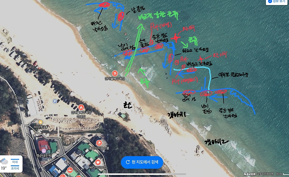 초소 좀 더 왼쪽, 주차장 정면 쪽에서 바다로 나가는 조류가 흐르니